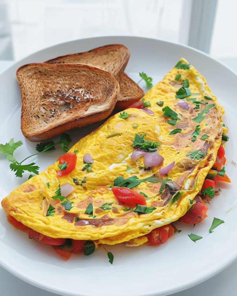 A fluffy, protein-packed omelette filled with colorful vegetables — perfect for breakfast or post-workout fuel.