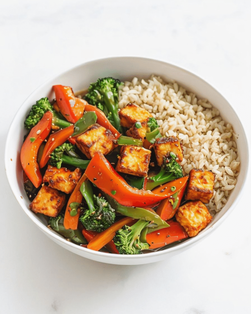 A quick and healthy tofu stir-fry made with colorful vegetables and a soy-ginger sauce. This vegan-friendly meal is protein-packed, delicious, and perfect for meal prep.